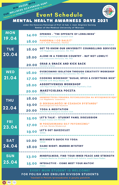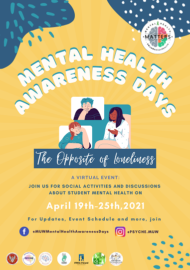 Więcej informacji na stronie Fb wydarzenia: MUW Mental Health Awareness Days 2021 (www.facebook.com/MUWMentalHealthAwarenessDays).
