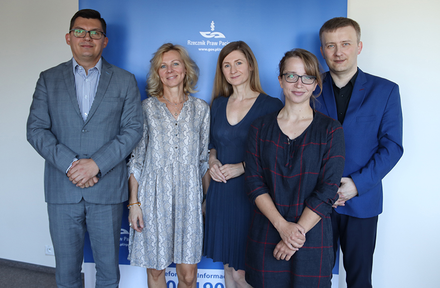 Spotkanie ekspertek WUM z przedstawicielami Rzecznika Praw Pacjenta, wrzesień 2020. Od lewej: Grzegorz Błażewicz – Zastępca Rzecznika Praw Pacjenta, dr hab. Dorota Włodarczyk i dr Magdalena Łazarewicz, Aleksandra Wenelczyk i Grzegorz Saj – Departament ds. Zdrowia Psychicznego Biura Rzecznika Praw Pacjenta.